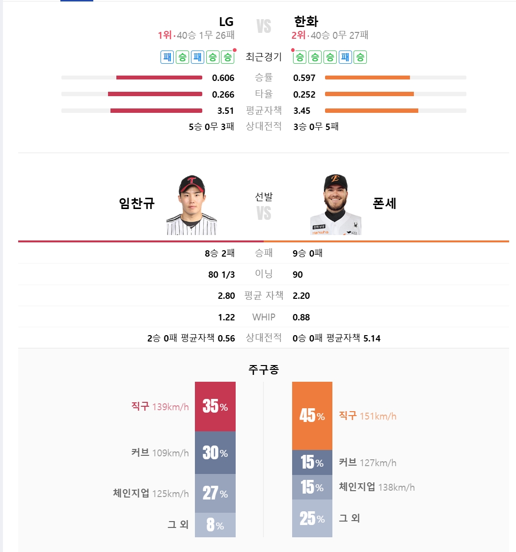 폰세 선수는 역시 150km/h가 넘는 강속구 직구가 주무기네요! 반면 임찬규 선수는 직구, 커브, 체인지업을 적절히 섞어 던지는 변화구 위주의 투수입니다. 서로 다른 스타일의 에이스들이 어떤 투수전을 펼칠지 벌써부터 기대돼요.