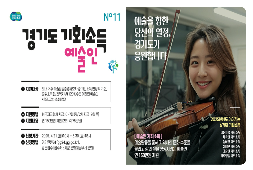 | 지원 대상 | 2025.4.21. 기준 도내 28개 시·군에 주민등록이 있고, 예술활동증명서 보유, 소득인정액 월 2,870,416원 이하 |